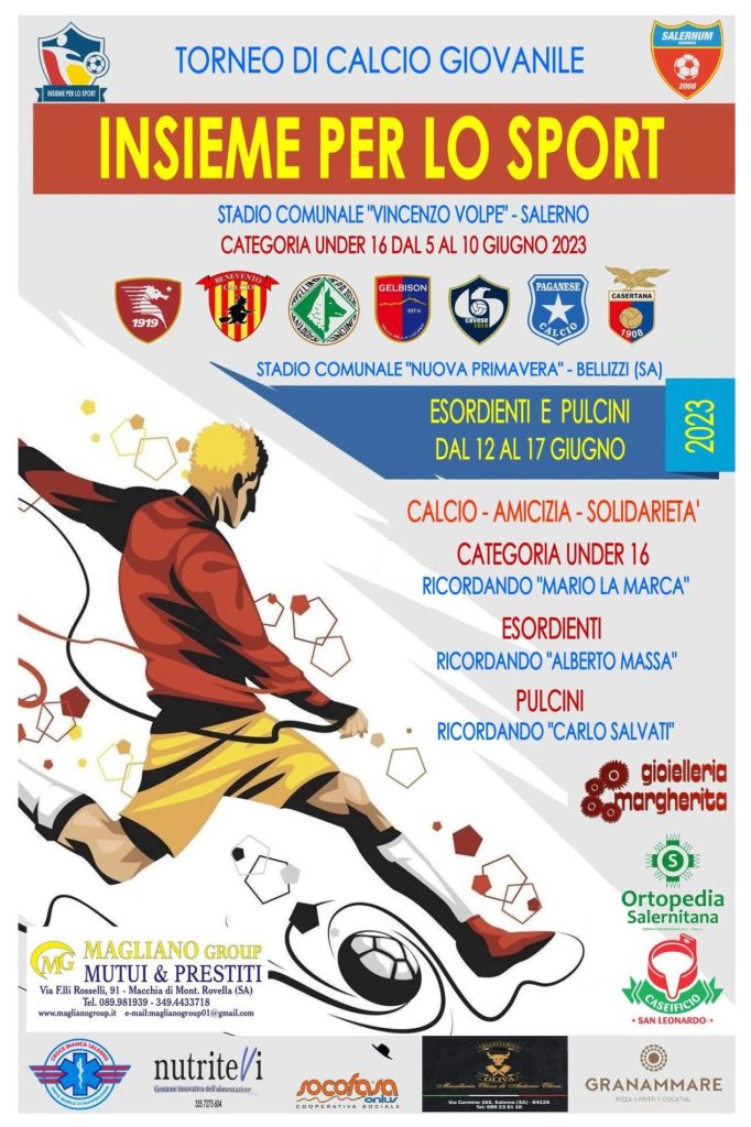 Aggregazione, amicizia e tanto calcio. Dal prossimo 5 giugno, per circa due settimane, ritorna il prestigioso torneo di calcio giovanile “Insieme per lo Sport” organizzato dalla società sportiva Salernum Baronissi 2008, dal responsabile Mario Avallone e da Alfonso Zoccola. Una kermesse molto attesa per quanto riguarda il panorama del calcio giovanile salernitano, che anche quest’anno vedrà una grandissima partecipazione di ragazzi, pronti a darsi “battaglia” sul rettangolo verde.
