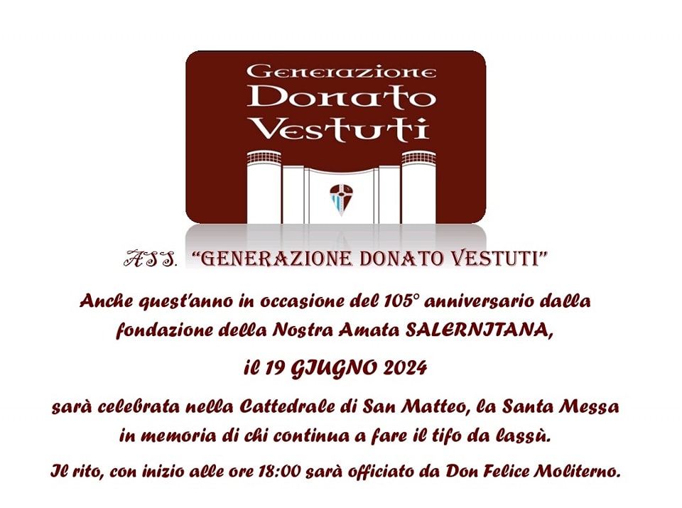 Il 105esimo anniversario della Salernitana si avvicina, e l’associazione Generazione Donato Vestuti, come ogni anno, ha organizzato la Santa Messa al Duomo, a partire dalle ore 18,00 in suffragio dei tanti supporters che popolano la Curva del Paradiso. A celebrare il rito sarà Don Felice Moliterno.