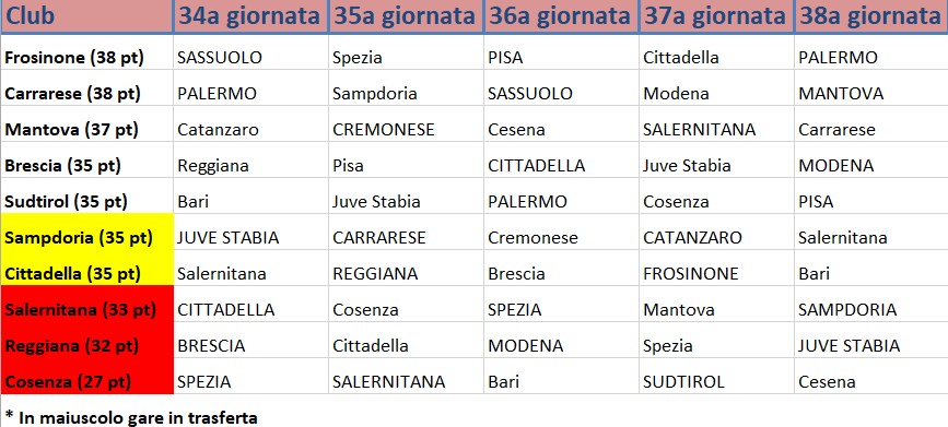 La Salernitana, al momento terzultima, ĆØ a 2 punti sia dai playout che dalla salvezza diretta. Vincere a Cittadella significherebbe sicuramente realizzare almeno un sorpasso. Ma il lunedƬ di Pasquetta annovera ancheĀ Brescia-ReggianaĀ come scontro diretto da brividi. Analizzando i calendari, quattro sono scontri diretti che attendono la Salernitana cosƬ come il Cittadella. I veneti saranno ospiti del Frosinone alla penultima giornata con i ciociari però alle prese con un cammino da alto coefficiente di difficoltĆ . Unāaltra data da cerchiare in rosso ĆØ quella del 25 aprile: nello stesso giornoĀ Salernitana-Cosenza, Reggiana-Cittadella e Carrarese-Sampdoria. Roba da brividi.